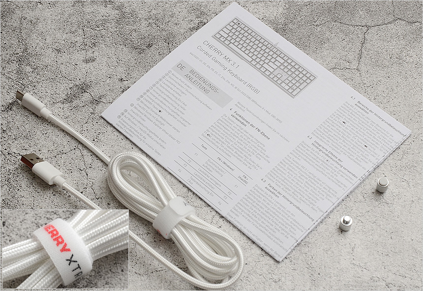 풀KIT 의 모습으로 키보드를 비롯해 퀵 매뉴얼과 USB 케이블이 제공되며 일반 키보드와 달리 높이조절을 위한 나사가 제공되는 것이 눈에 띈다. (사용 방법은 바닥면 부분에서 확인하기 바란다.)
