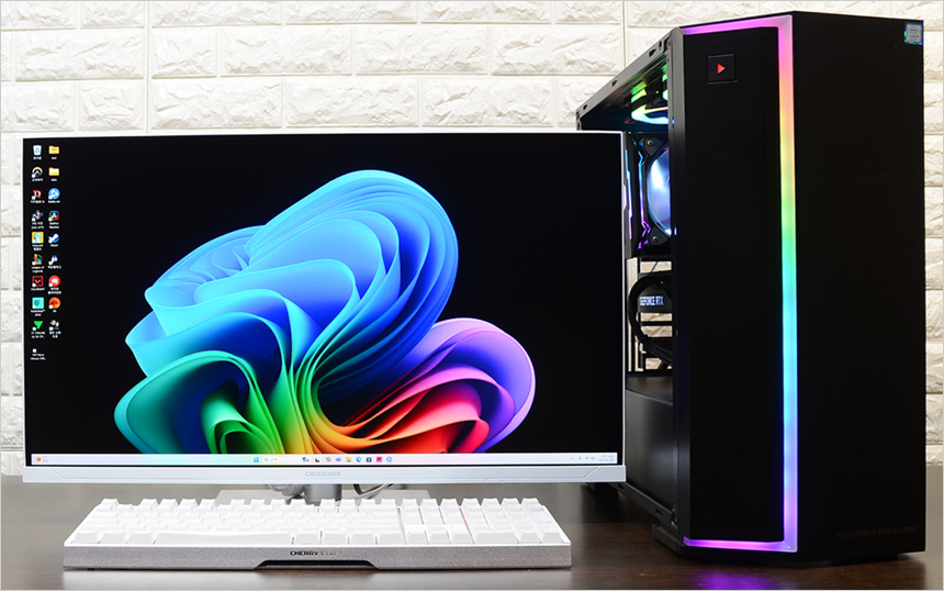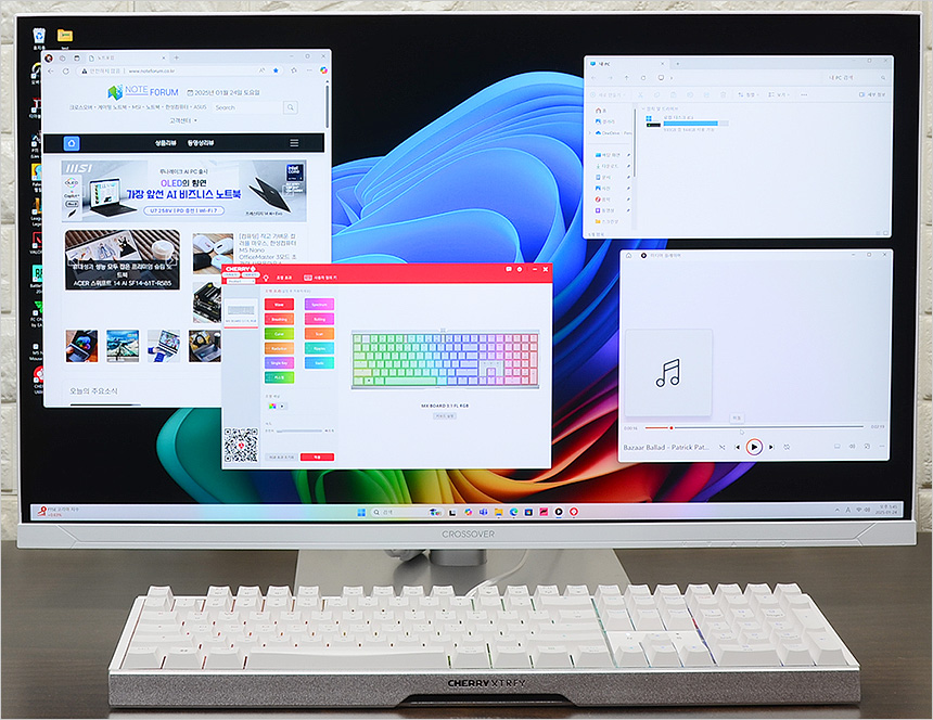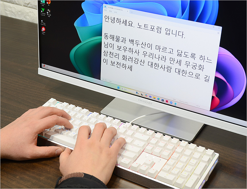 테스트를 위해 책상에 PC와 키보드를 설치한 모습으로 풀사이즈 모델이지만 슬림베젤로 크기를 최소화 해 많은 공간을 차지하지 않았다. (참고로 모니터의 크기는 27형 이다.)