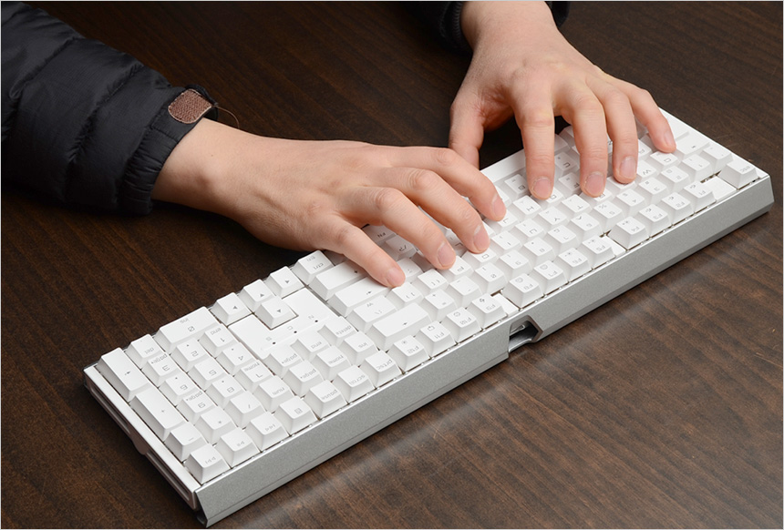 타이핑 테스트를 진행하고 있는 모습으로 알루미늄 하우징을 적용해 무게감이 상당한 제품답게 다소 과격한 타이핑시에도 흔들림이 전혀 발생하지 않았으며 소켓 돔 링을 비롯한 풀윤활에 이중 흡음재를 적용한 보강구조 제품답게 잡음없는 깔끔한 타건음을 선사했다. 참고로 리니어 방식의 적축은 클릭 방식의 청축대비 상당히 정숙한 타건음을 보여주기는 하지만 맴브레인 대비 큰 소리를 들려주기 때문에 사무실에서 사용하거나 조용한 터컨음을 선호한다면 저소음 적축을 사용하기 바란다.