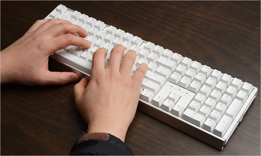 108키 풀배열 키보드로 키간격이 넓어 여유롭게 손을 올려두고 타이핑 할 수 있었다. 고품질의 ABS 키캡을 사용해 땀 등으로 인해 눌러붙는 등의 불쾌감을 유발하는 일부 유광코팅 키캡과 달리 손가락으로 전해지는 키의 느낌도 상당히 좋은 편이었으며 스텝스 컬쳐2 디자인을 적용해 상단에 있는 키보드 자연스럽게 누를 수 있었다.