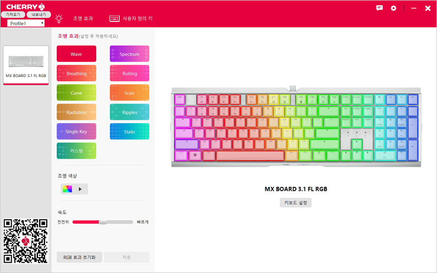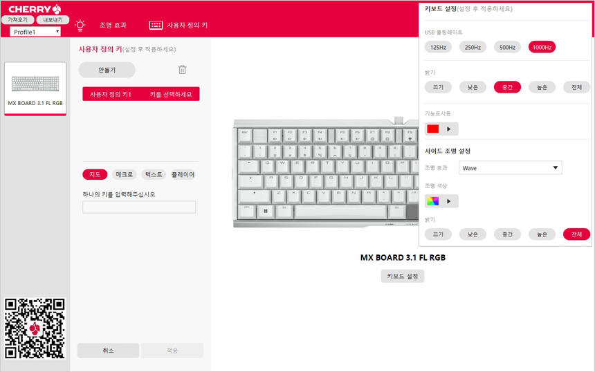 체리 S/W를 실행한 모습으로 (S/W 는 PC디렉트 홈페이지 자료실에서 다운로드 받을 수 있다.) 다양한 조명 효과를 지원해 선택의 폭을 넓혔으며 커스텀 기능도 지원해 자신만의 키보드를 만들 수 있다. 또한 조명 색상 및 효과 속도 조절이 가능하며 사용자 정의키를 통해 매크로 등을 적용할 수 있다.