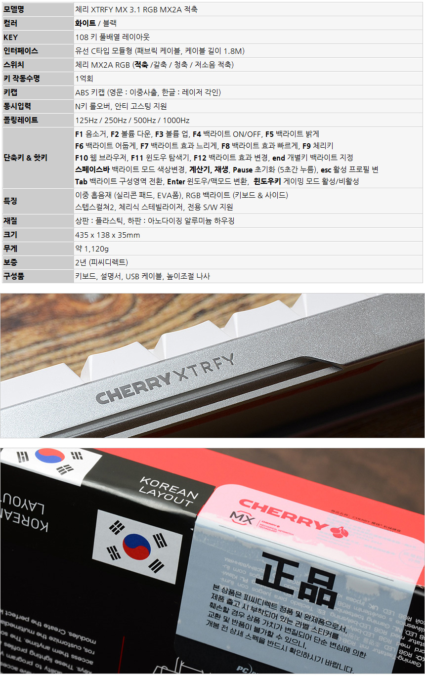 참고로 체리 XTRFY MX 3.1 RGB MX2A 적축은 국내 대형 PC제품 유통사인 PC 디렉트에서 A/S를 진행하고 있다. 정식 수입제품은 2년 무상보증 서비스를 지원해 문제가 발생했을 때 손쉽게 조치를 받을 수 있다. (비정품 모델은 문제가 발생했을 때 서비스를 받기 힘들다. 제품 구입시 정품 여부를 꼭 확인하기 바란다.)