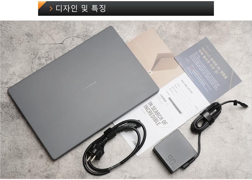 풀KIT 의 모습으로 노트북을 비롯해 90W 전원 어댑터와 전원 케이블이 제공되며 보증서, 퀵 매뉴얼이 포함된 것을 확인할 수 있다. (65W 전원 어댑터를 제공하는 경쟁 모델들과 달리 90W 전원 어댑터를 지원한다. 성능에 신경쓰겟다는 의미로 해석하면 된다.)