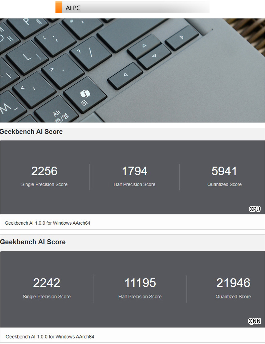 AI 전용 벤치마크 툴을 이용해 AI 성능 테스트를 진행하고 있는 모습으로 AI 에 특화된 CPU가 탑재된 모델답게 높은 스코어를 보여주었다. (얼마전 리뷰를 진행했던 인텔코어 울트라 258V와 라이젠 AI 9 365 탑재 노트북 보다 CPU 스코어가 높다.)