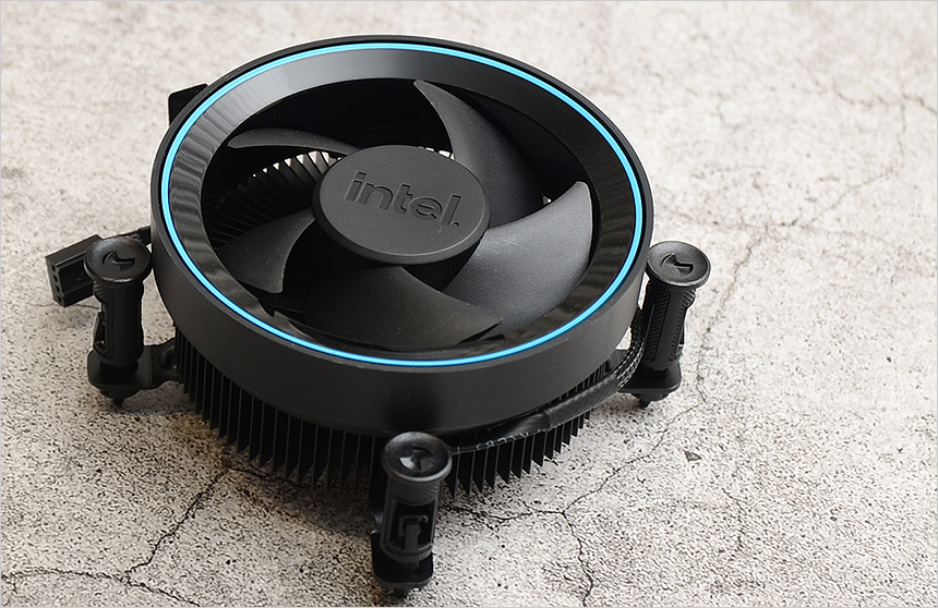 기본 제공되는 쿨러의 모습으로 구형 CPU와 달리 디자인이 상당히 세련된 것을 확인할 수 있다. 쿨러를 별도로 구입해 사용해야 하는 K프로세서와 달리 기본 쿨러만으로 열을 충분히 제어할 수 있어 쿨러 구입으로 인한 비용을 절약할 수 있다. (단, CPU가 최대 성능으로 동작하는 전문작업시 팬소음이 커지기 때문에 정숙한 PC환경을 만들고 싶다면 3만원 미만의 엔트리급 공랭쿨러를 구입해 장착해 주기 바란다.)