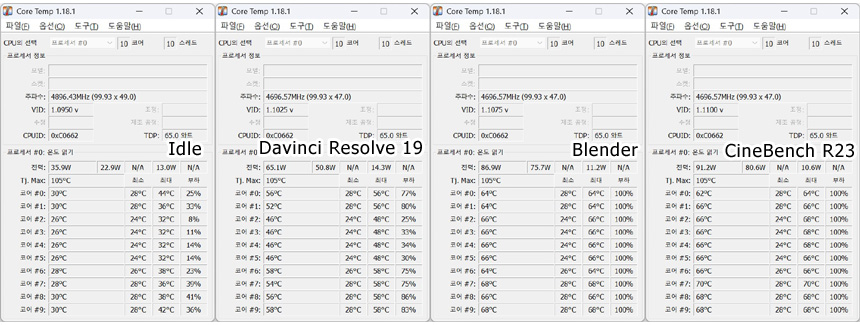 공정개선이 이루어진 제품이니 만큼 가장먼저 온도 테스트를 진행해 보았다. (실내온도 10도) 아이들 상태에서는 20도 후반으로 동작했으며 CPU가 최고성능으로 동작하는 블랜더나 시네벤치 실행시 60도 초반까지 온도가 올라가는 것을 확인할 수 있었다.