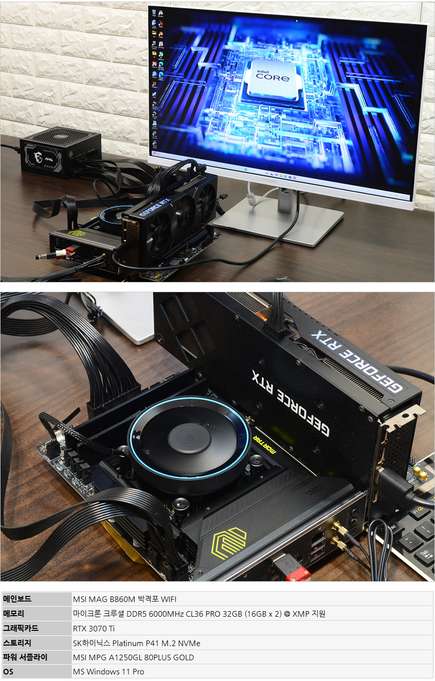 테스트를 위해 시스템을 구성한 모습으로 CPU가 오버클럭을 지원하지 않아 Z890 메인보드를 사용하지 않고 MSI MAG B860 박격포 WIFI 메인보드를 사용했으며 메모리는 XMP를 지원하는 32GB 듀얼채널 튜닝램을 장착했다. 또한 RTX 3070 Ti 그래픽카드와 최상급 SSD인 SK하이닉스 P41을 장착했다. 여유로운 전원 공급을 위해 1250W 의 고급형 파워서플라이인 MAG A1250GL 80PLUS GOLD를 사용했으며 쿨러를 기본 제공해 다른 CPU 와 달리 수랭쿨러는 장착하지 않았다.