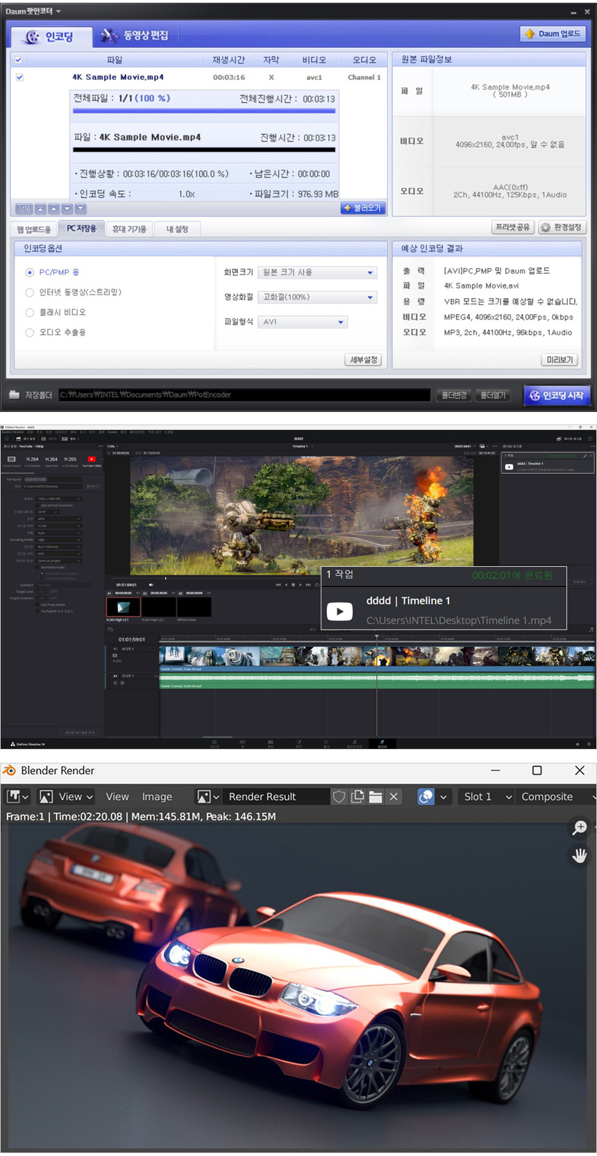 동영상 인코딩과 4K 랜더링 테스트를 진행하고 있는 모습으로 i5-14400과 비교해 인코딩 시간은 27초 단축 되었고 블랜더 랜더링에서는 17초 단축된 것을 확인할 수 있었다. @ 다빈치 리졸브 랜더링도 2분여 단축 되었지만 버전이 달라 직접 비교는 힘들다.