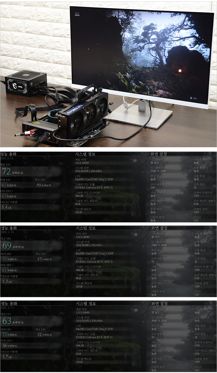 검은신화 오공 벤치마크를 실행한 모습으로 높음 옵션에서 4K 기준 63 프레임을 보여 주었으며 QHD 에서는 69까지 프레임이 높아졌다. 사용했던 RTX 3070 Ti 급의 그래픽카드를 사용할 경우 옵션을 낮추는 것을 추천하며 울트라 옵션에서 게임을 즐기고 싶다면 RTX 4070 이상의 그래픽카드 사용을 추천한다. (DLSS를 활성화 하면 프레임을 높일 수 있다.)