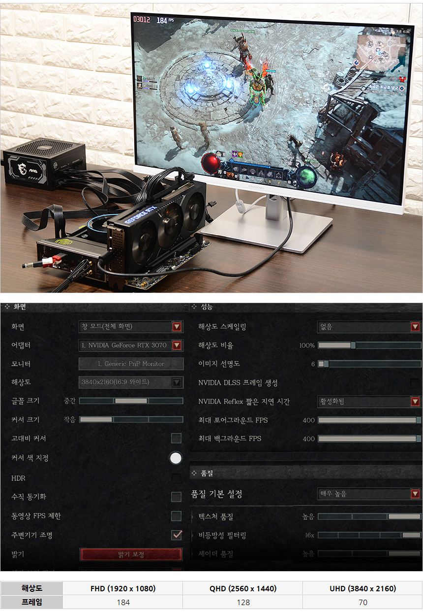 마지막으로 디아블로 4를 이용해 프레임 테스트를 진행했는데 (키오바샤드에서 측정) DLSS를 사용하지 않았음에도 프레임이 상당히 높은 것을 확인할 수 있었다. 해상도나 옵션에 관계없이 부드럽게 게임을 즐길 수 있다.