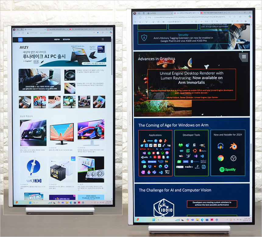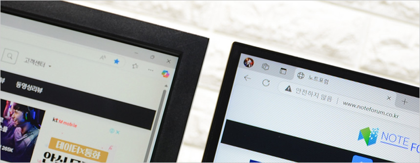 모니터를 셋팅한 김에 베젤 두께를 비교해 보았는데 사진과 같이 큰 차이가 발생하는 것을 확인할 수 있다. 날렵한 사이즈가 매력적이며 배젤 등으로 인한 답답함 없이 영상을 즐길 수 있을 것이다.