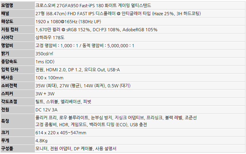 이번에 리뷰를 진행 할 크로스오버 27GFA950 Fast-iPS 180 화이트 게이밍 멀티스탠드는 높은 주사율과 빠른 응답속도를 선호하는 게이머를 위한 고성능 모니터로 144Hz 나 165Hz를 지원하는 경쟁 모델들과 달리 180Hz 고주사율을 지원해 빠른 움직임도 더 정확하게 확인하고 빠르게 대응할 수 있으며 1ms 응답속도를 지원해 잔상등으로 인한 스트레스 없이 사용할 수 있다.