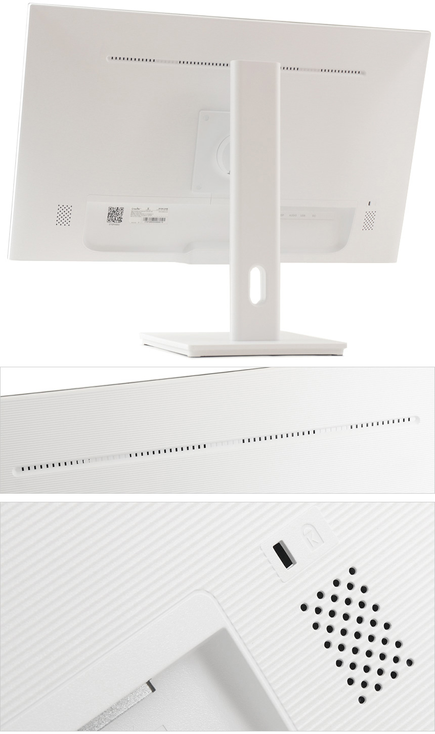 모니터 후면부의 모습으로 상단에 통풍구가 설치되어 있고 하단 양 측면에는 3W 스피커가 장착되어 시원시원한 사운드를 즐길 수 있다. 또한 도난 방지를 위한 시큐리티 홀도 제공되는 것을 확인할 수 있다.