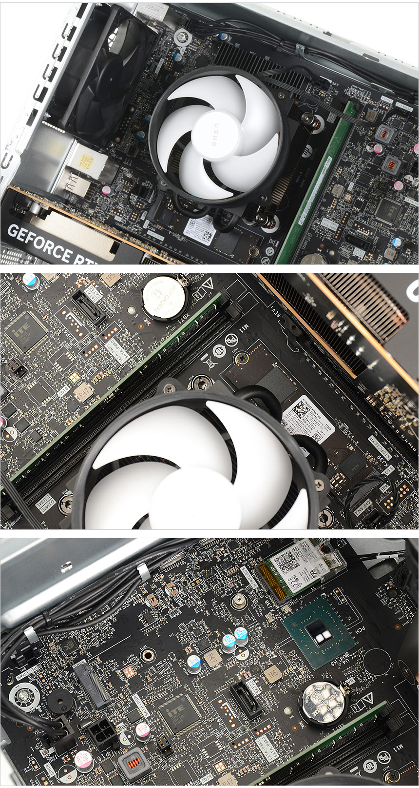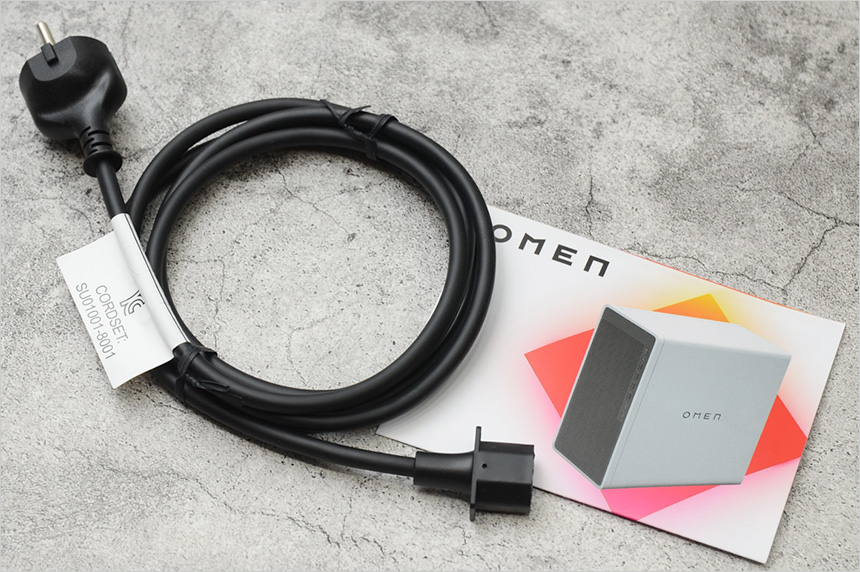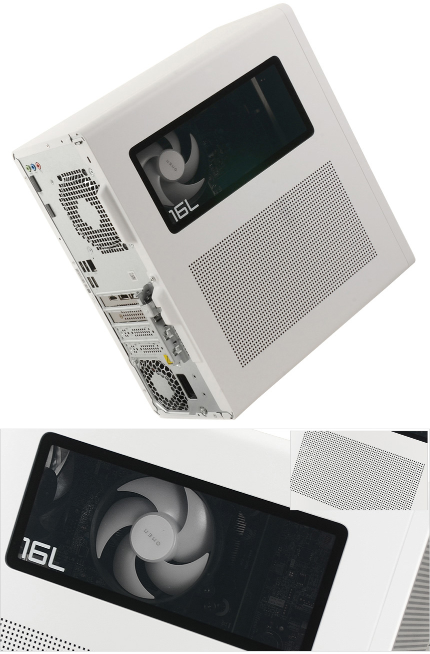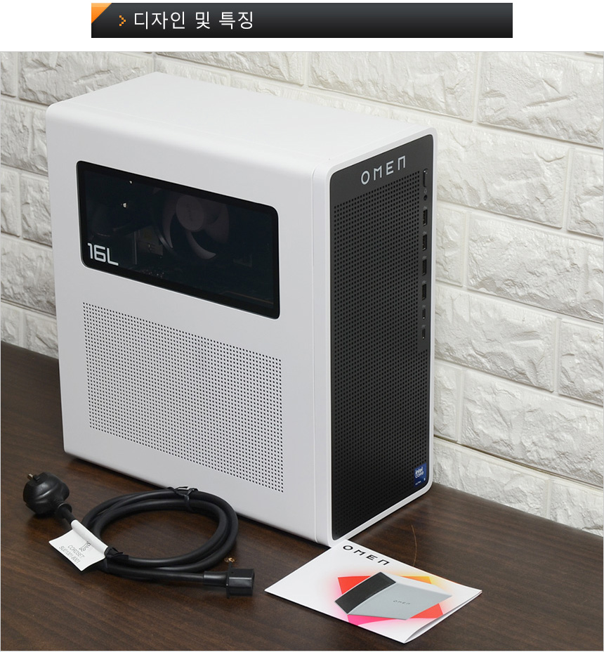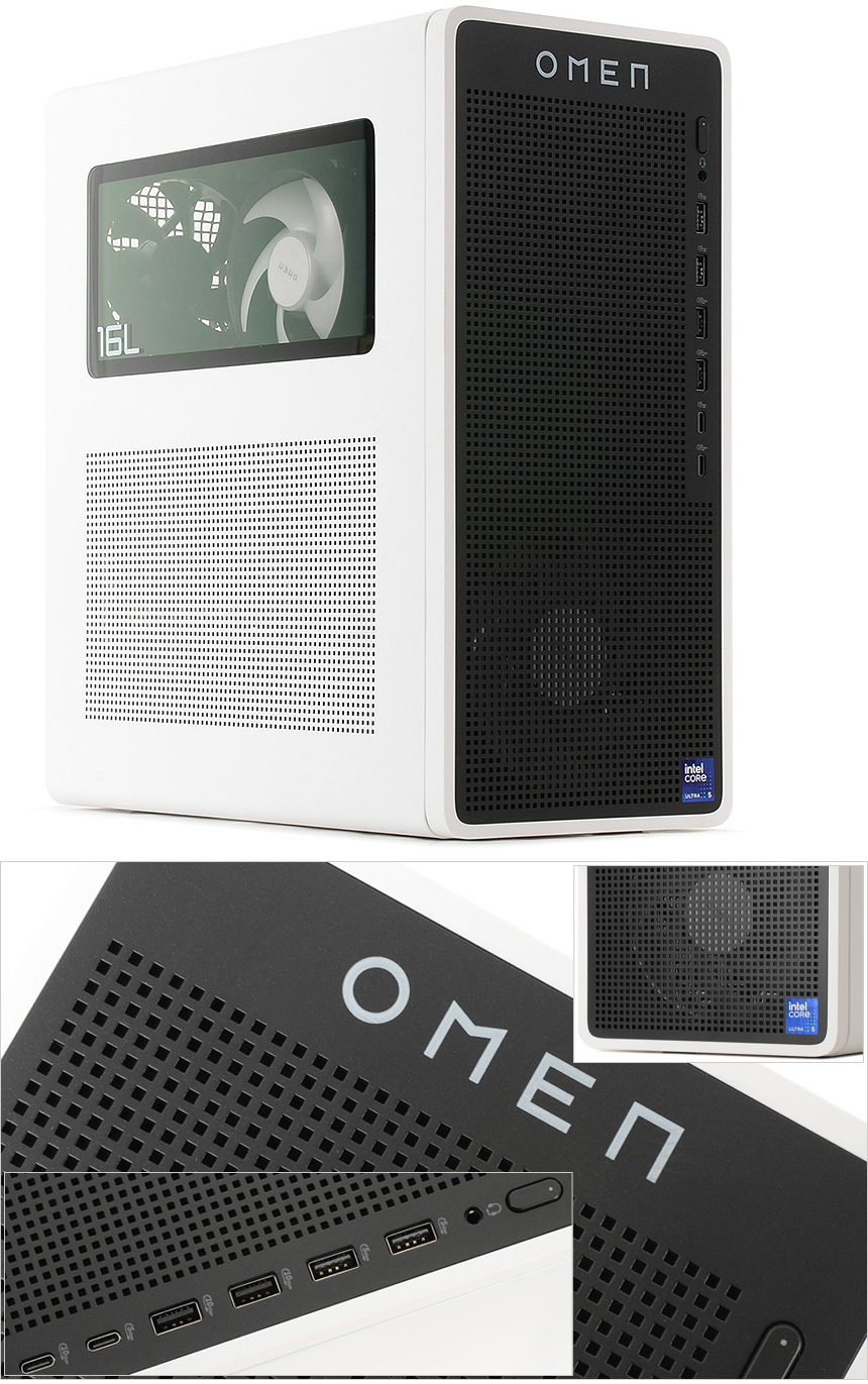 PC 전면부의 모습으로 상단에 OMEN 레터링이 세겨져 있으며 원활한 공기 유입으로 안정성을 높이기 위해 전면 전체에 통풍구가 설치된 것을 확인할 수 있으며 주변기기를 연결할 수 있도록 전면에 단자가 설치된 것도 눈에 띈다. 상단에는 전원 버튼과 상태표시 LED, 헤드셋이나 이어폰 연결을 위한 오디오 (COMBO) 단자가 설치되어 있고 하단에는 4개의 A타입 USB 단자와 (USB 3.2 Gen1 & Gen2 각각 2개) C타입 단자 (USB 3.2 Gen1 & Gen2 각각 1개)를 지원해 빠른 데이터 전송이 가능하며 많은 주변기기를 연결해 사용할 수 있다.