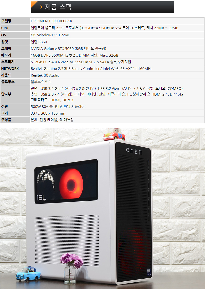 이번에 리뷰를 진행 할 HP OMEN TG03-0006KR 게이밍 데스크탑은 FHD 나 QHD 해상도의 게이밍 모니터와 좋은 궁합을 보여주는 모델로 인텔코어 울트라 5 225F 와 RTX 5060, 16GB DDR5 메모리를 탑재해 최신 게임들을 상위 옵션에서 부드럽게 즐길 수 있으며 영상편집 등의 크리에이터 용도로 사용할 수 있다. 또한 NPU 가 탑재된 최신 프로세서 탑재와 높은 AI 퍼포먼스를 보여주는 그래픽카드가 더해져 생성형 AI 제작 용도로도 활용할 수 있다.
