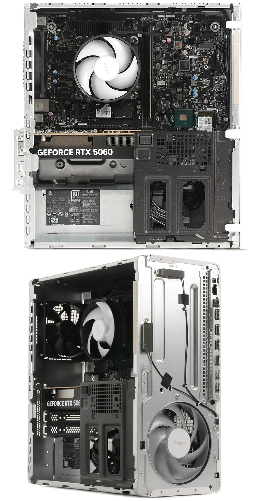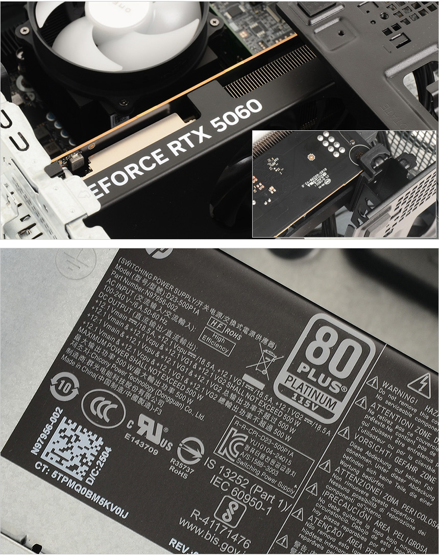 중앙부에 RTX 5060 그래픽카드가 장착된 것을 확인할 수 있으며 (그래픽카드의 흔들림을 방지하기 위해지지대가 추가된 것이 눈에 띈다.) 하단에는 80+ 플래티넘 인증으로 효율성을 높인 500W 파워 서플라이가 장착된 것을 확인할 수 있다. (80+ 인증을 받지 않거나 브론즈 등급의 파워서플라이를 사용하는 조립PC들과는 효율성이나 안정성에서 차이를 느낄 수 있을 것이다.