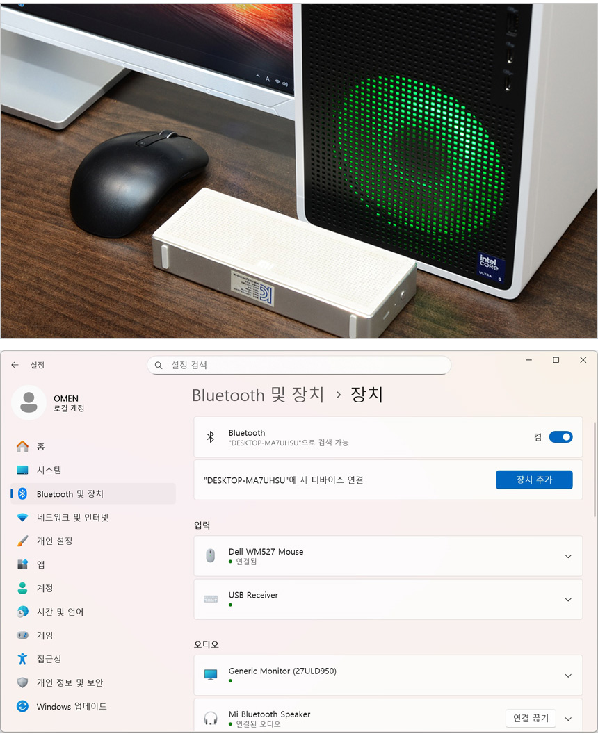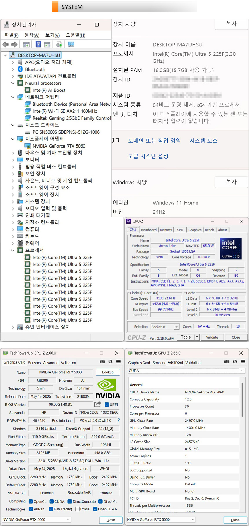 시스템 정보를 확인하고 있는 모습으로 새로운 공정으로 적용해 전성비를 한층 높이고 NPU 탑재로 다양한 AI 애플리케이션을 편하게 사용할 수 있는 인텔코어 울트라 5 225F 프로세서가 장착된 것을 확인할 수 있다. 또한 프리도스를 지원해 OS와 드라이버 등을 일일이 설치해야 하는 경쟁 모델들과 달리 윈도우 11 Home을 기본 탑재해 사용성을 높였다. 초보자도 구입즉시 사용할 수 있으며 정품 OS 사용이 필수적인 기업 환경에서도 제약없이 사용할 수 있다.