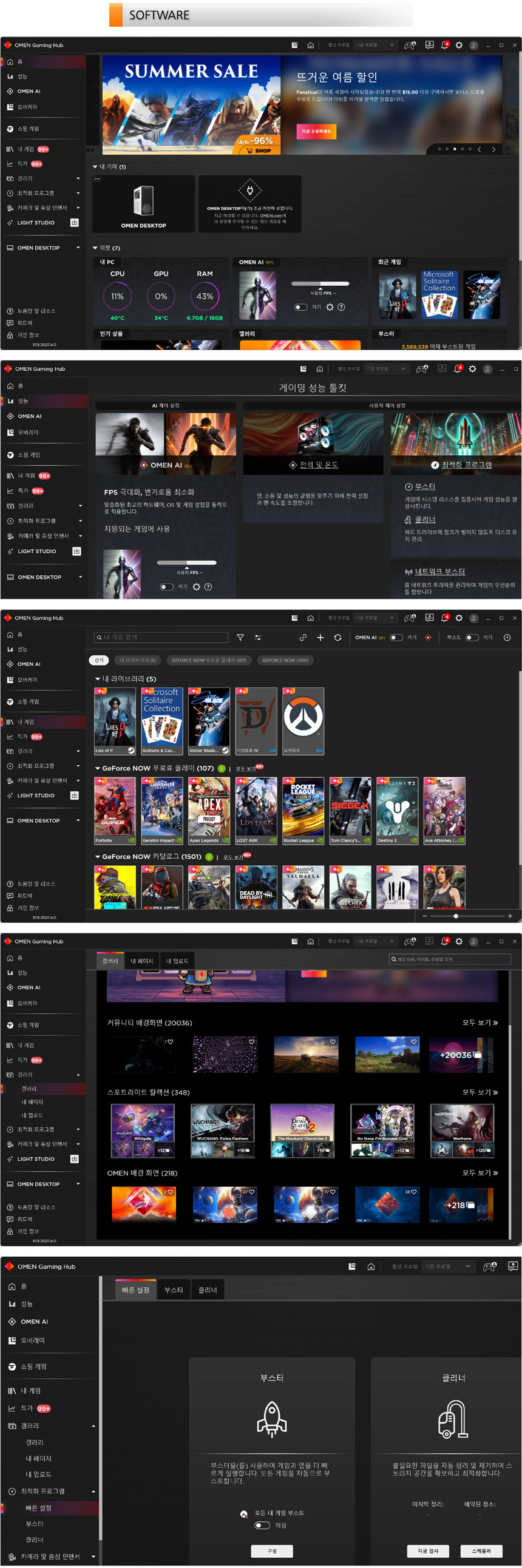 게이밍 PC의 사용성을 한층 높여주는 오맨 게이밍허브를 지원한다. CPU와 GPU 사용율 등을 모니터링 할 수 있으며 성능을 높일 수 있는 메뉴가 별도로 구성되어 있어 용도에 맞게 PC를 셋팅할 수 있다. 또한 라이브러리 메뉴가 제공되어 설치한 게임들을 편하게 실행할 수 있으며 갤러리 메뉴가 별도로 제공되어 배경화면을 손쉽게 교체할 수 있다.