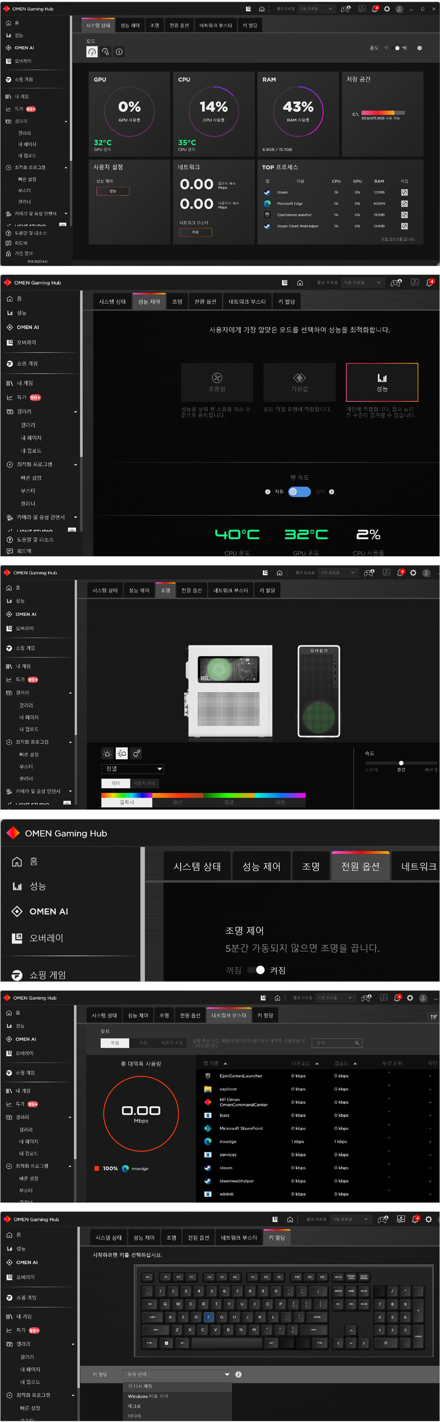 세부메뉴의 모습으로 시스템 모니터링이 가능하며 퍼포먼스와 팬속도 등을 원하는 대로 지정할 수 있다. 또한 디자인 부분에서 언급한 것과 같이 조명 효과를 설정할 수 있으며 절전기능과 네트워크 부스트, 키보드 맵핑 기능을 제공한다.
