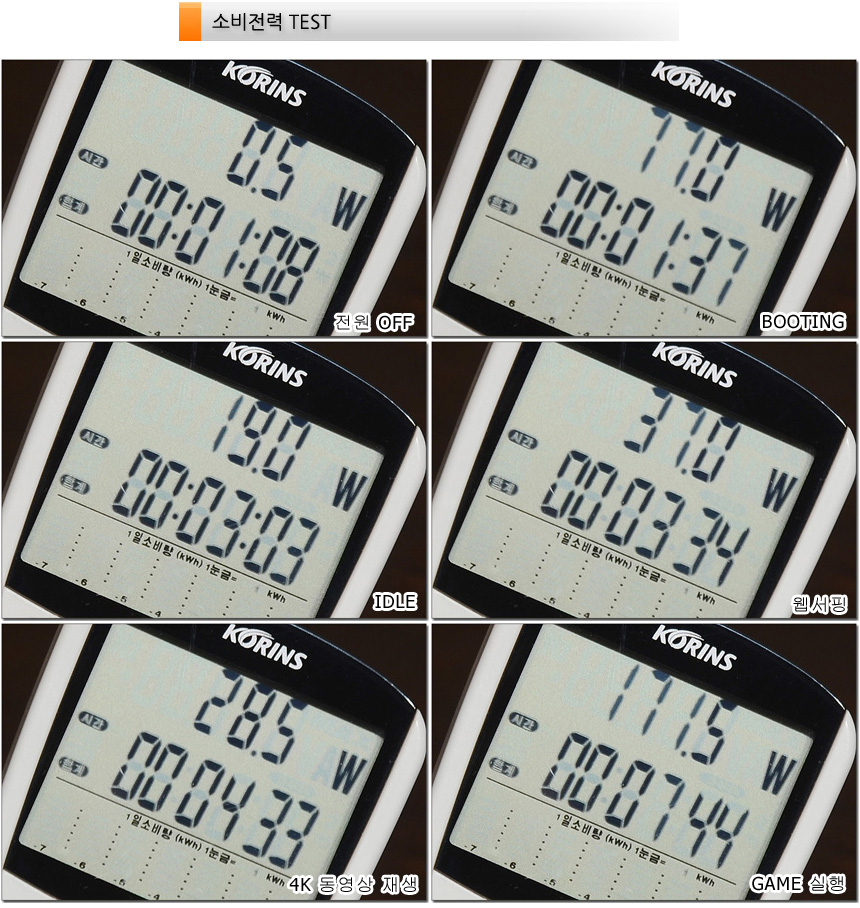 소비전력 테스트를 진행하고 있는 모습으로 (최고성능 모드) 캐주얼한 작업에서는 50W 이내의 낮은 소비전력으로 작동했으며 게임에서는 210W 까지 소비전력이 올라가는 것을 확인할 수 있었다. (게임에 따라 소비전력이 다르다. 오버워치2 의 경우 170W 정도까지 올라가는 반면 디아블로 4 에서는 210W 까지 소비전력이 올라갔다.)