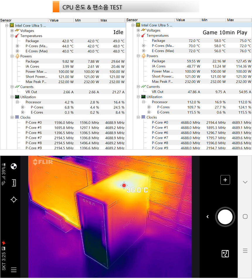 CPU 온도 테스트를 진행한 모습으로 (최고 성능모드, 실내온도 27도) 아무것도 하지 않는 Idle 상태에서는 40도 초반으로 동작했으며 게임을 10분 정도 플레이 하고 측정했을 때에는 70도 초반까지 온도가 올라가는 것을 확인할 수 있었다. 또한 열화상 카메라를 이용해 게임 실행시 열분포를 확인해 보았는데 CPU가 위치해 있는 상단부가 뜨거운 것을 확인할 수 있다.