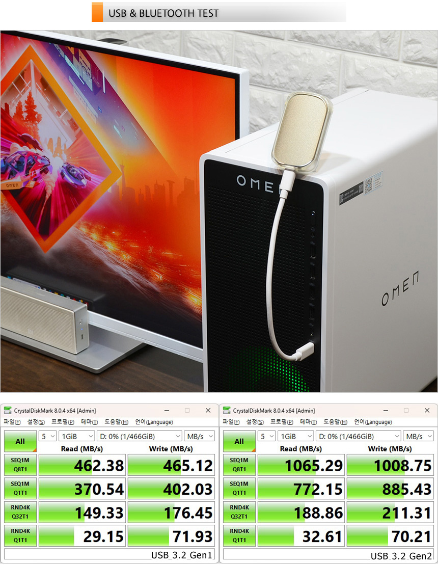 PC 전면에 USB 3.2 Gen2 단자를 지원해 빠른 데이터 전송이 가능하다. 상단의 사진은 USB 3.2 지원 외장 SSD를 이용해 속도 테스트를 진행하고 있는 모습으로 USB 3.2 Gen1과 확연히 비교되는 빠른 속도를 보여주었다.
