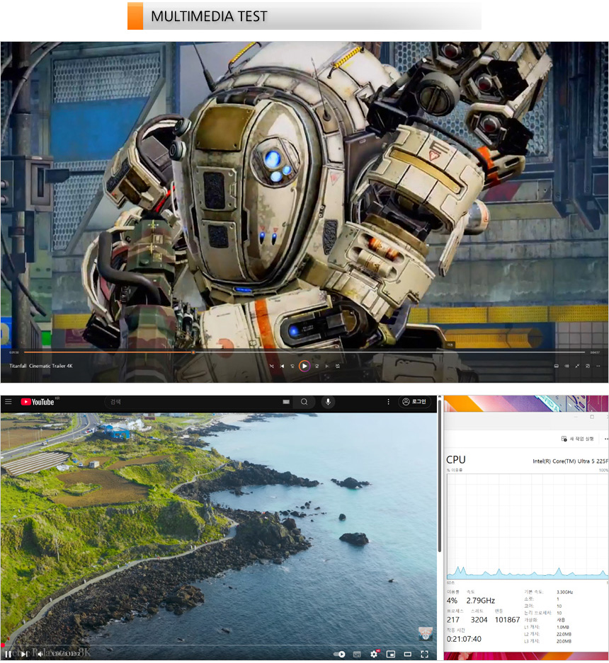 4K 동영상을 이용해 멀티미디어 테스트를 진행하고 있는 모습으로 고성능 데스크탑PC 답게 부드럽게 재생되는 것을 확인할 수 있었다. 유튜브 4K 동영상이나 고화질 영상을 즐길때 성능으로 인한 부족함은 느끼지 않을 것이다. 또한 유튜브 고화질 동영상을 이용해 CPU 점유율을 테스트 해 보았는데 (2160P@60FPS) 4-10% 대의 점유율을 보여 주었으며 인터넷을 실행했을 때 30% 후반까지 점유율이 올라가는 것을 확인할 수 있었다.
