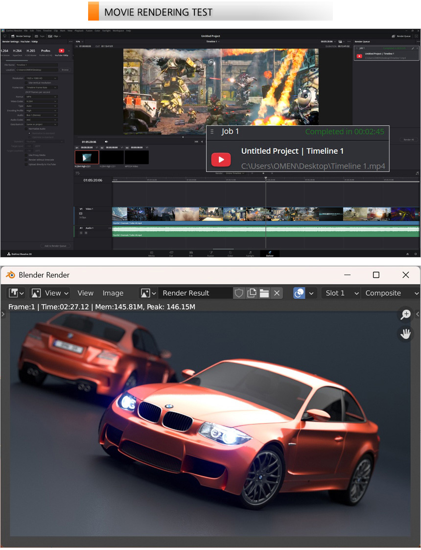 영상편집 S/W 다빈치 리졸브를 이용해 랜더링 테스트를 진행하고 있는 모습으로 (640MB, 920MB, 990MB 4K 동영상을 단일 동영상으로 랜더링, FHD 해상도에 H.264 비디오 코덱) 2분 45초가 소요되는 것을 확인할 수 있었다. 또한 블랜더 랜더링 테스트에서도 4~5분대의 시간을 보여주는 일반 PC와 달리 2분대의 빠른 랜더링 시간을 보여주었다. (게이밍에 특화된 모델이지만 영상편집 등의 작업용으로도 유용하게 사용할 수 있다.)