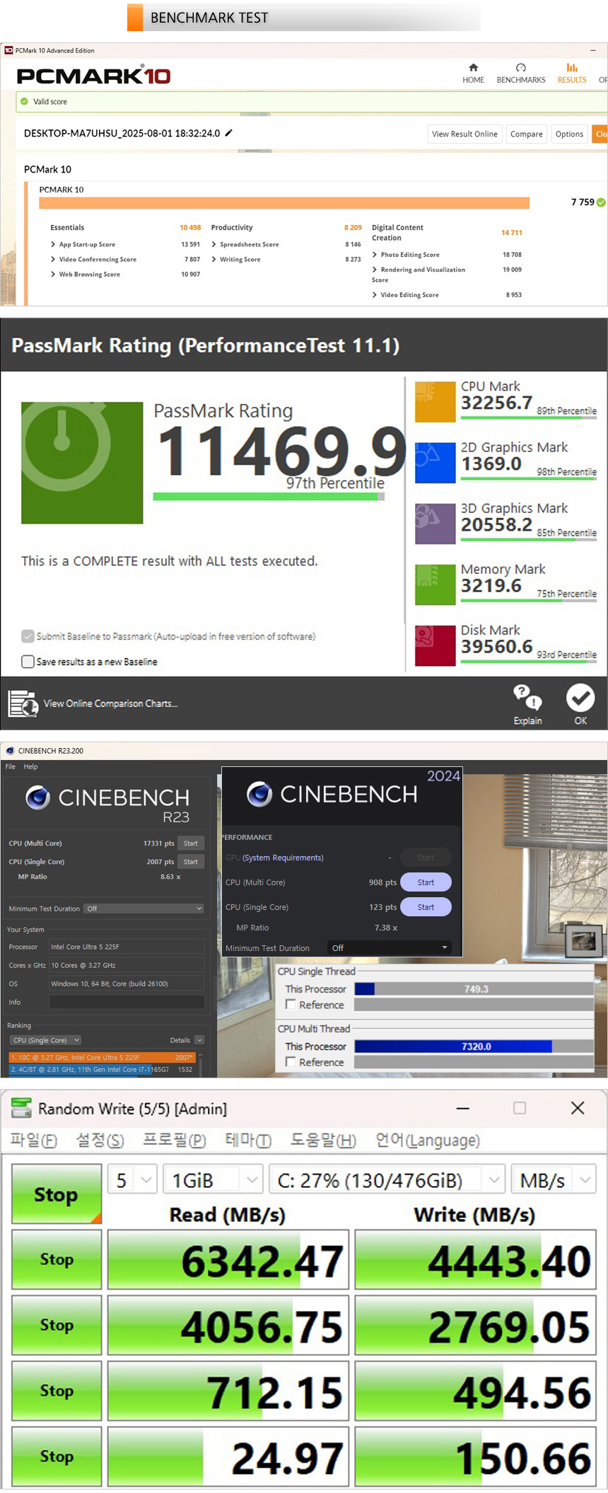 다양한 벤치마크 프로그램을 이용해 기기의 성능을 확인하고 있는 모습으로 게임은 물론 작업용으로도 편하게 사용할 수 있는 높은 스코어를 보여주었다. 다용도로 PC를 사용할 수 있을 것이다. 또한 저장장치의 속도를 확인해 보았는데 PCIe 4.0 NVMe SSD를 사용해 속도가 상당히 빠른 것을 알 수 있다.