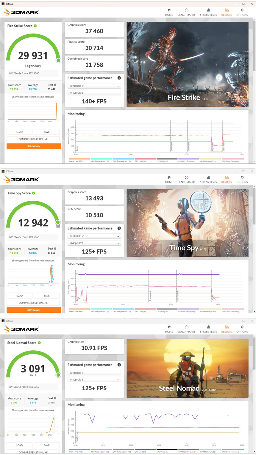 3DMARK를 이용해 3D 퍼포먼스를 확인하고 있는 모습으로 최신 게임도 상위 옵션에서 부드럽게 플레이 할 수 있는 스코어를 보여주었다. (RTX 4060 과는 분명한 스코어 차이를 보여주었다.)