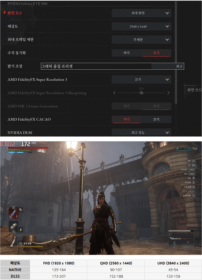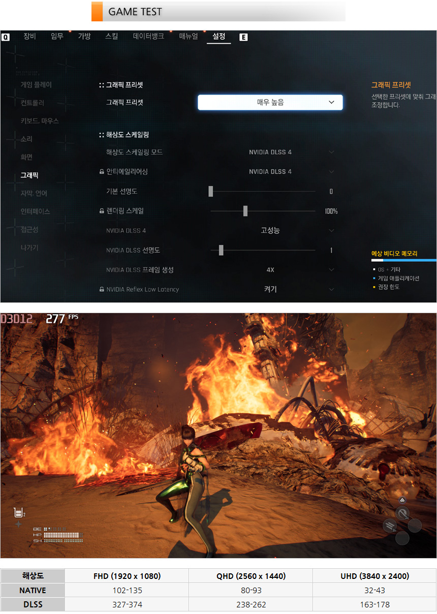 큰 인기를 끌고 있는 스텔라 블레이드를 플레이 하고 있는 모습으로 DLSS를 사용하지 않아도 QHD나 FHD에서 부드럽게 게임을 즐길 수 있었다. (4K로 게임을 즐길 경우 DLSS4 사용이 필수적이다.)