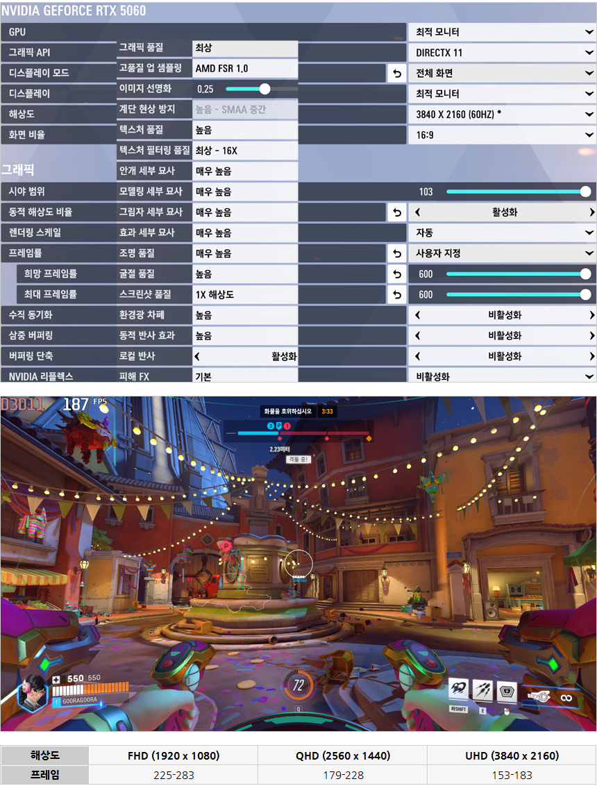 오버워치2를 이용해 게임 테스트를 진행하고 있는 모습으로 4K 해상도에서도 100 프레임 이상을 보여주었다. FHD와 QHD 해상도의 경우 옵션을 조정해 주면 240Hz 와 180Hz 게이밍 모니터 사용이 가능하다.