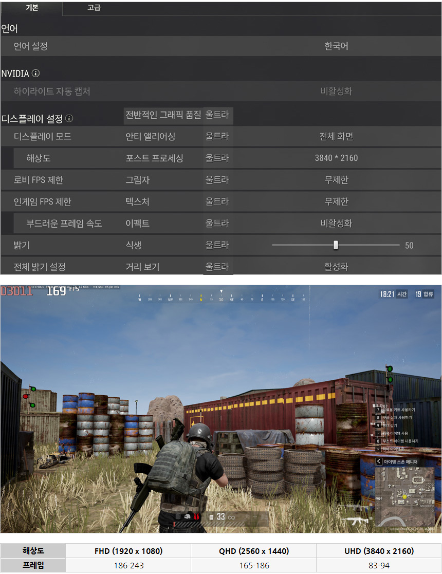 배틀그라운드를 울트라 옵션에서 플레이 하고 있는 모습으로 (연습모드) 4K 해상도에서도 플레이 자체는 가능하며 QHD 해상도 부터는 게이밍 모니터를 사용할 수 있는 성능을 보여주었다. (국민옵션등을 적용하면 QHD 에서도 180Hz 게이밍 모니터를 사용할 수 있다.)