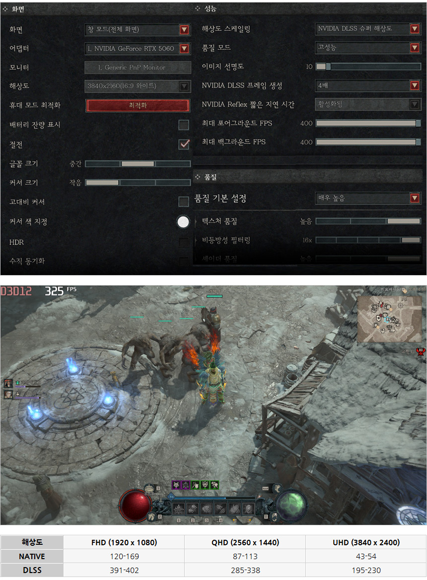 디아블로 4를 매우높음 옵션에서 플레이 하고 있는 모습으로 NATIVE 와 DLSS 간의 성능차가 상당히 큰 것을 확인할 수 있었다. 해상도에 제한없이 게임을 즐길 수 있을 것이다. @ 디아블로 4는 업데이트를 통해 프레임 4배 생성이 가능해 졌다. 이점 참조 바란다.