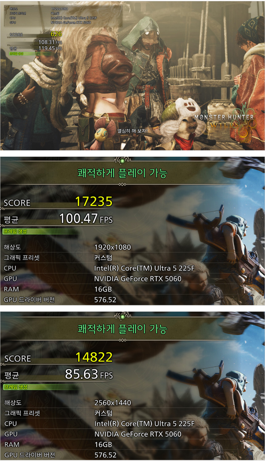 몬스터 헌터 와일드 벤치마크 테스트를 진행하고 있는 모습으로 높음 옵션으로 설정했을 때 FHD와 QHD 해상도 모두 부드럽게 게임을 즐길 수 있다. 단, DLSS를 이용한 프레임 생성은 필수라 말씀드린다. @ 벤치 프로그램이 불안정해 4K 테스트에서는 계속 문제가 발생했다. 8GB 비디오 전용램이기 때문에 QHD 로 게임을 즐기기 바란다.