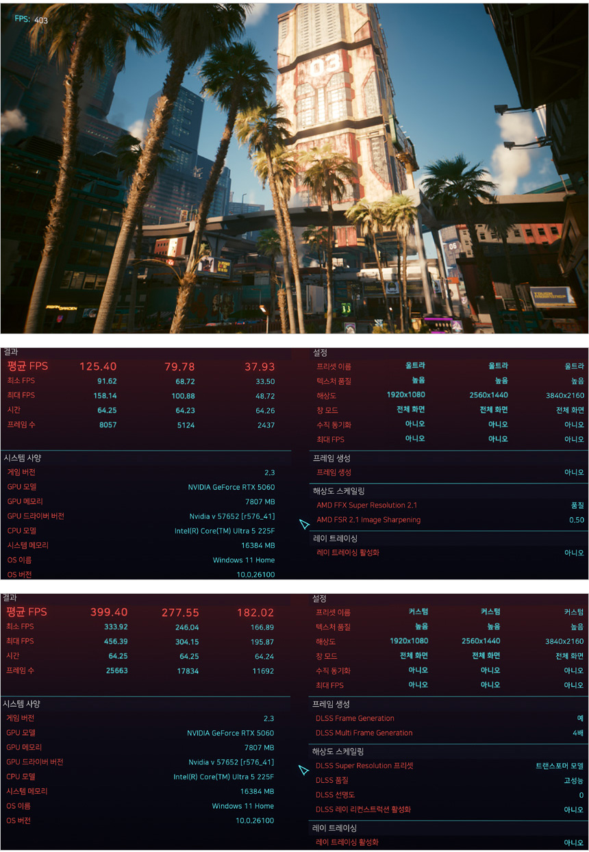싸이버펑크 2077 벤치마크를 울트라 옵션에서 실행한 모습으로 DLSS를 적극적으로 활용하면 4K 에서도 원활하게 플레이 할 수 있었다. (DLSS를 적용하면 프레임이 엄청나게 높아진다.)