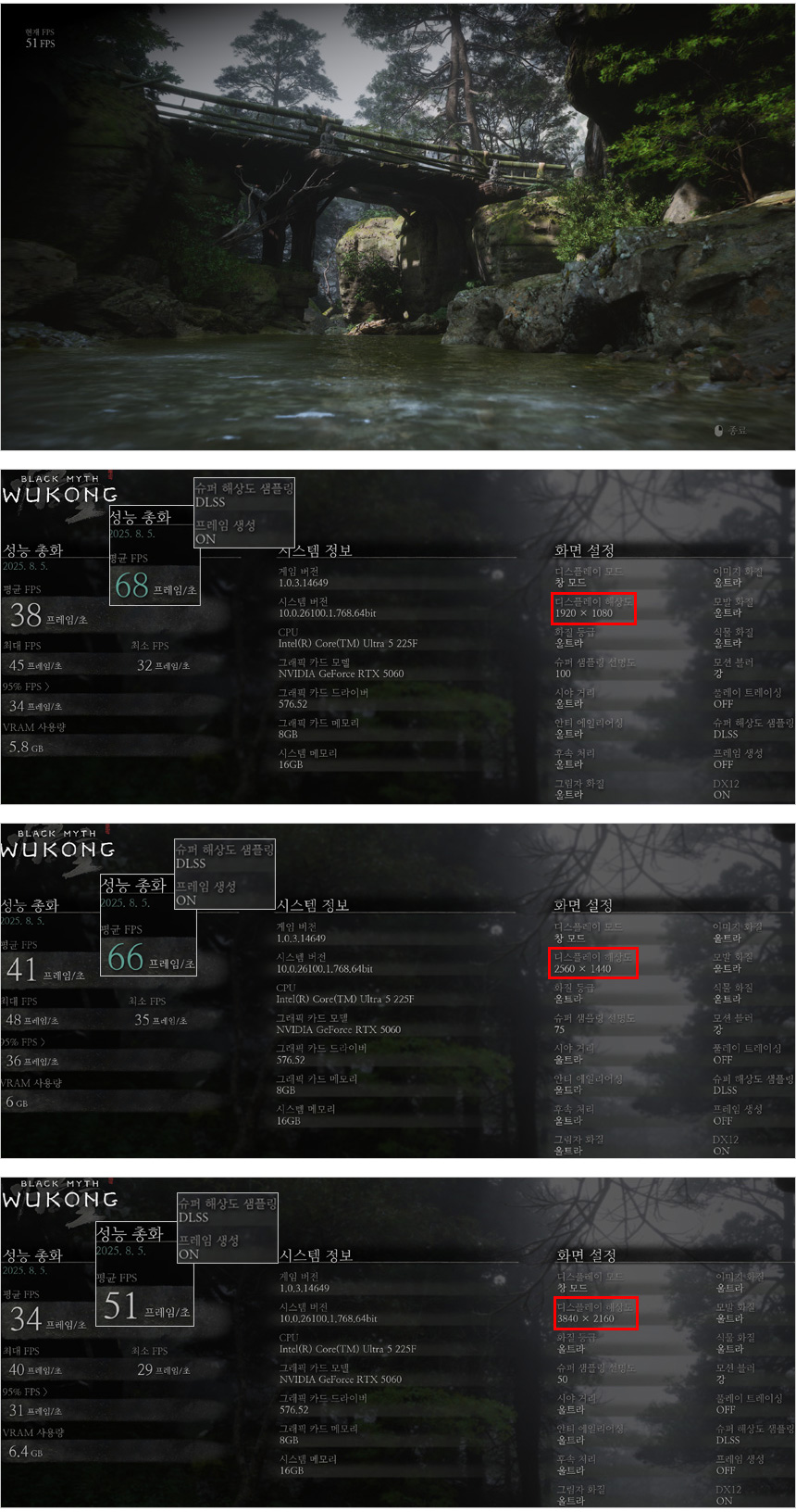 검은신화 오공 게임의 벤치마크를 실행한 모습으로 해상도별 프레임 변화가 크지 않은 것을 확인할 수 있다. DLSS를 적용하면 프레임이 유의미하게 상승하기 때문에 꼭 DLSS 프레임 생성을 활성화 해 게임을 즐기기 바란다.