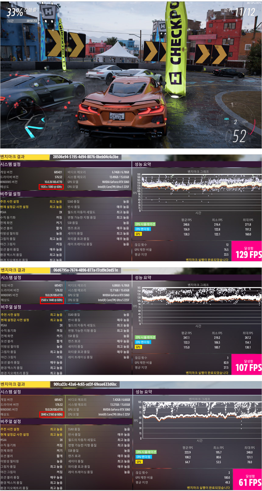 포르자 호라이즌 5 벤치마크를 최고 높음으로 실행한 모습으로 4K 의 경우 약간 벅찬 느낌인데 반해 QHD 에서는 100프레임을 념겨 부드럽게 게임을 즐길 수 있다.