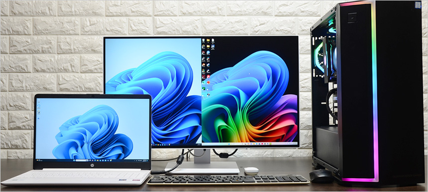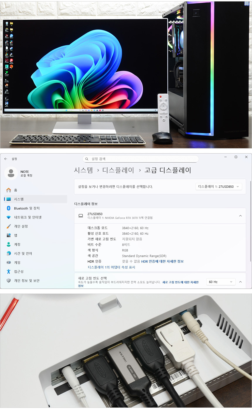 테스트를 위해 PC와 모니터를 사무실 책상에 설치한 모습으로 30형대 모니터와 달리 공간으로 인한 스트레스 없이 손쉽게 설치할 수 있었다. 집이나 사무실 책상 공간이 협소 하더라도 설치해 사용하는데 부담은 없을 것이다. 다양한 단자를 지원해 PC는 물론 노트북이나 스마트폰, 게임콘솔, OTT 플레이어 등 다양한 디바이스와 연결할 수 있으며 KVM 기술을 지원해 USB 단자를 다용도로 활용할 수 있다.
