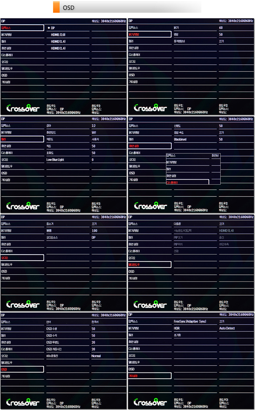 OSD 상세설정의 모습으로 밝기나 명암 설정이 가능하며 게임에서 유용하게 사용할 수 있는 블랙레벨, 프리싱크 등의 설정이 가능하다. 뿐만 아니라 색온도와 OSD, 볼륨, PIP와 PBP 설정도 가능하다. (리모콘을 제공해 편의성을 높였으며 핫키를 지원해 입력소스, 화면비율, 조준선, 볼륨 등을 빠르게 설정할 수 있다.)
