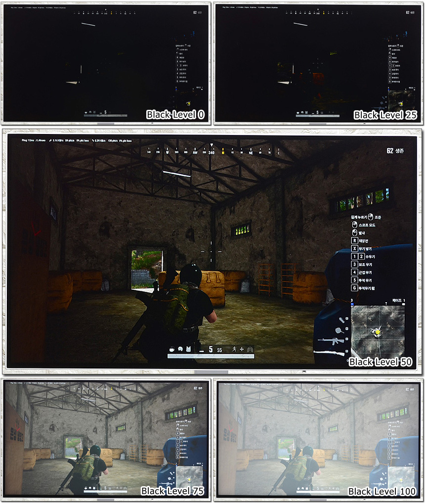 적절한 블랙레벌 조정을 통해 게임에서 시인성을 높일 수 있다. 밝아지는 만큼 색감이 떨어지기 때문에 선명도와 시인성을 전반적으로 고려해 설정하기 바란다.