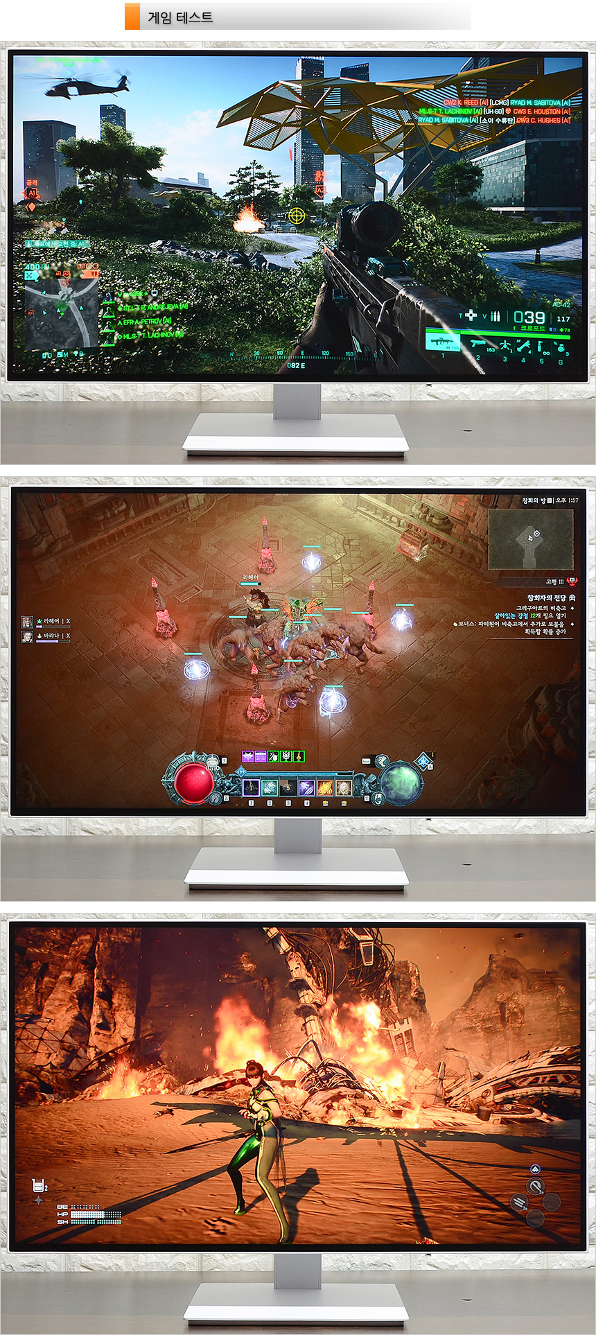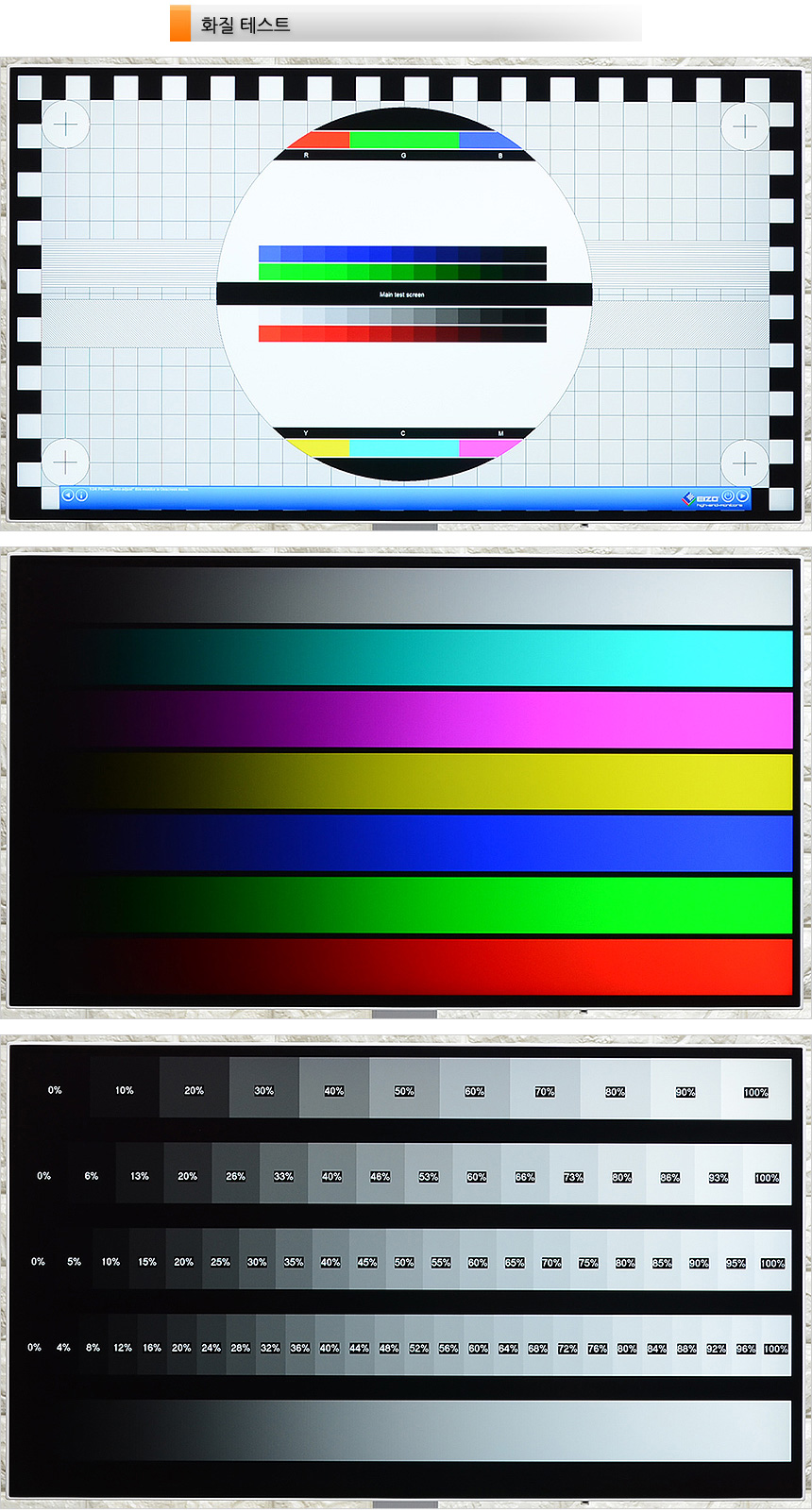 테스트 프로그램을 이용해 화질 테스트를 진행하고 있는 모습으로 1670만 컬러를 지원하는 일반적인 FHD 모니터와 달리 10억 7천만 컬러를 지원해 색의 변화가 무척 자연스러우며 픽셀 피치가 조밀해 더 진한 컬러감을 경험할 수 있었다. 색 표현력이나 디테일에서 일반 모니터와는 확연한 차이를 경험할 수 있을 것이다.