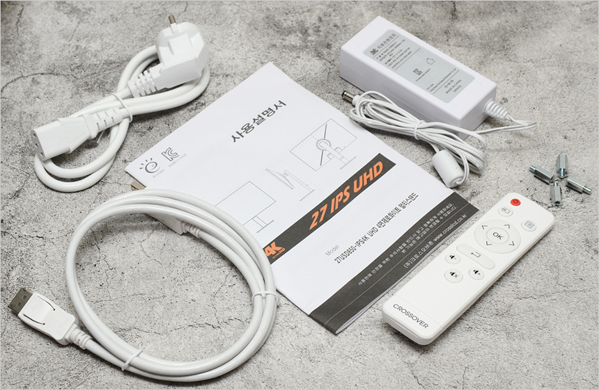 기본 제공되는 액세서리의 모습으로 전원 어댑터와 전원 케이블, DP 케이블이 제공되며 사용설명서, 리모콘, 베사 연장볼트 등이 포함된 것을 확인할 수 있다.