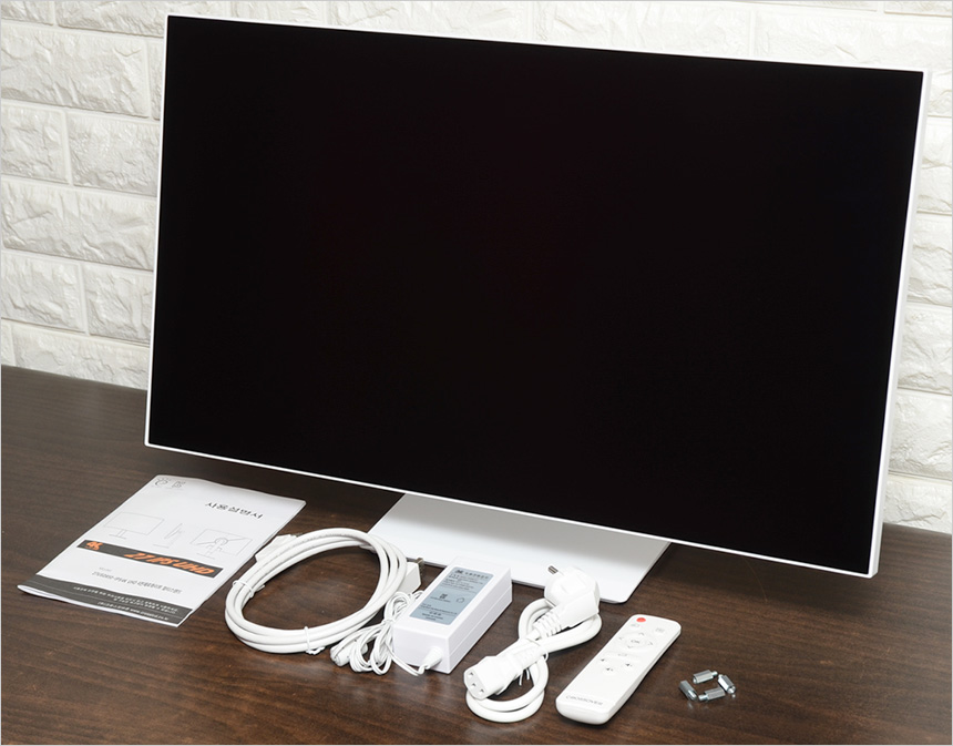 풀KIT 의 모습으로 모니터를 비롯해 전원 어댑터와 전원 케이블, DP 케이블을 제공하며 리모콘과 베사 연장볼트, 설명서가 포함된 것을 확인할 수 있다.