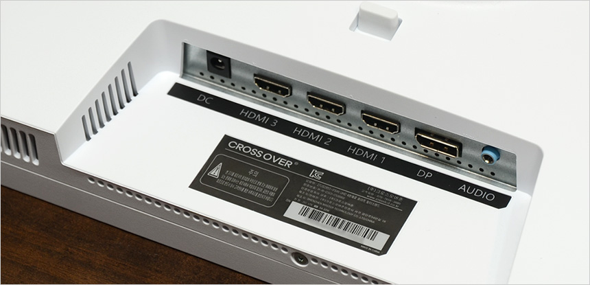 중앙에 75 x 75mm 의 베사홀이 설치되어 스탠드 장착 뿐만 아니라 벽에걸어 사용하거나 ARM 등에 장착해 활용할 수 있으며 하단에는 DP와 3개의 HDMI 단자를 지원해 다양한 디바이스 연결이 가능하다. (HDMI 2.0과 2개의 HDMI 1.4 지원)