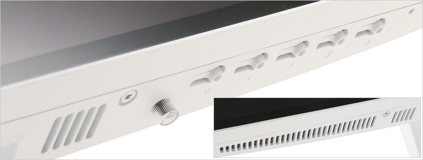 전면 하단부의 모습으로 리모콘 사용을 위한 IR 센서를 비롯해 안정성을 높이기 위해 통풍구가 설치되어 있다. 또한 모니터 환경설정을 위한 OSD 버튼과 LED 인디케이터가 설치된 것도 확인할 수 있다.