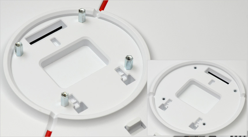 기본 장착된 멀티스텐드의 모습으로 케이블 정리를 위해 홀이 설치되어 있으며 바닥면에는 고무패드가 부착되어 미끄러짐을 방지한다.