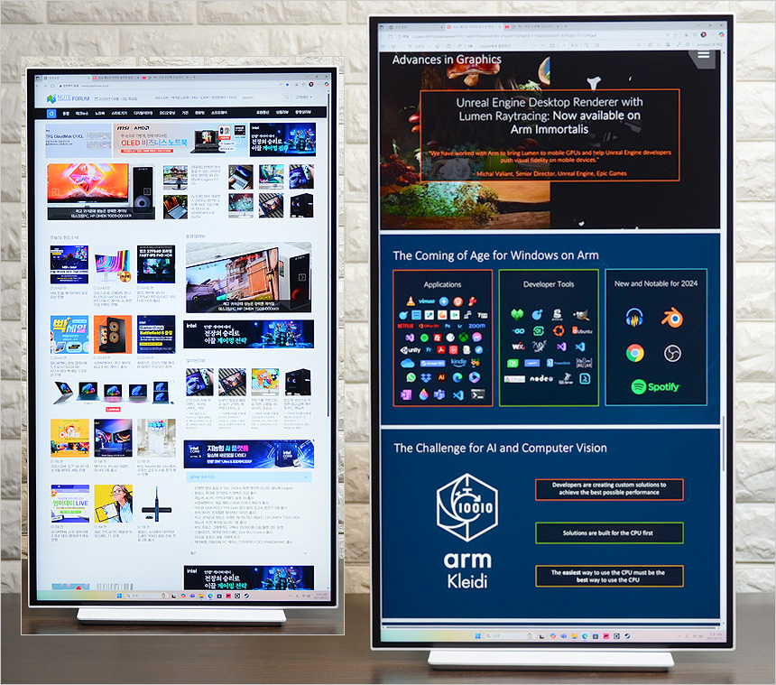 멀티스탠드 적용도 매력적인 부분이라 말씀드리고 싶다. 각도나 위치 조절에 한계가 있는 일반 모니터와 달리 어떤 환경에서도 사용자에 최적화된 각도 조절이 가능했으며 피벗 기능을 지원해 세로영상을 꽉찬 화면으로 즐길 수 있었다.
