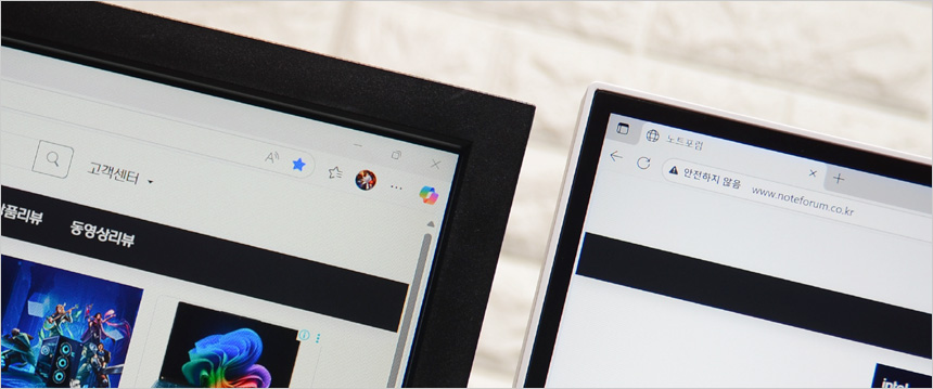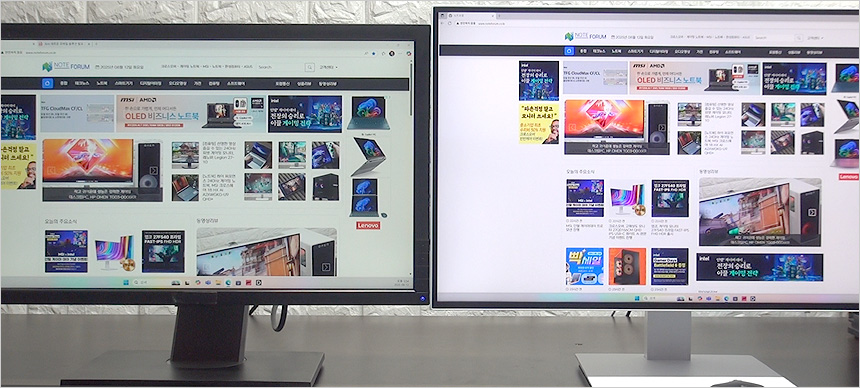 2대의 모니터를 셋팅해 테스트 하는김에 베젤 두께를 비교해 보았는데 사진과 같이 확연한 차이가 있는 것을 확인할 수 있었다.