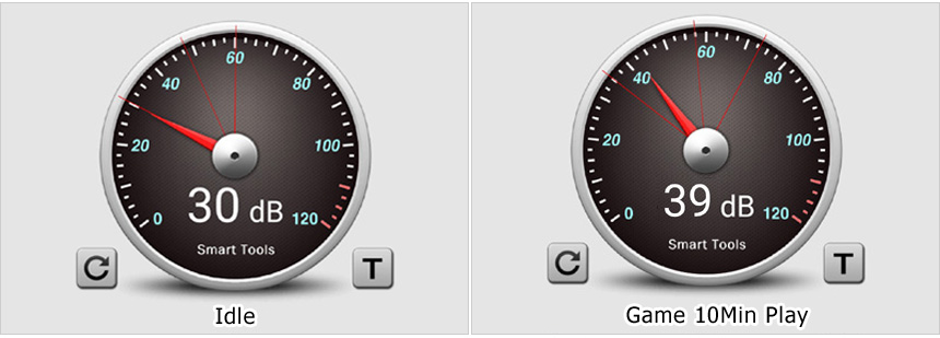 팬소음 테스트를 진행하고 있는 모습으로 Idle 상태에서도 미세하게 팬소음이 발생하는 것을 확인할 수 있었다. 게임을 실행하면 팬소음이 커지긴 하지만 고주파음이 아니기 때문에 크게 신경쓰이지 않았다. (PC 정면은 35dB로 비교적 조용한 반면 통풍구가 있는 좌측면은 팬소음이 더 크게 들렸다.) @ 측정값은 사무실의 생활소음을 포함한 팬소음이다. 이점 참조 바란다.